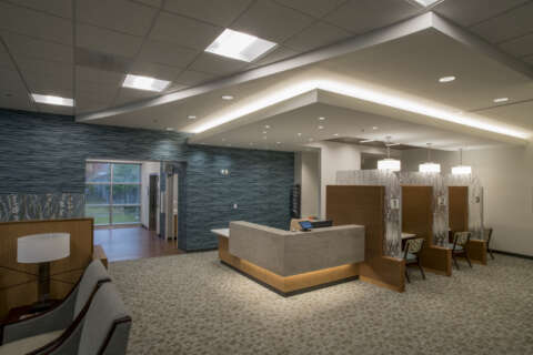 The interior design blends natural materials with contemporary forms and patterns, creating a warm yet sophisticated environment. Every material selection, from fire-resistant laminates to antimicrobial upholstery, was made with aesthetic appeal and code compliance. The flooring, with a high coefficient of friction, ensures safety while enhancing the design. Our comprehensive wayfinding package included everything from directional and identification signage to donor recognition displays, all carefully designed to make navigation effortless.